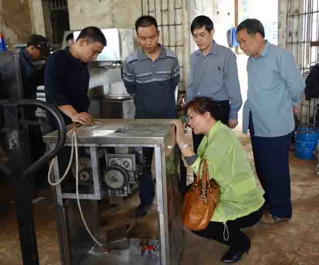 圖為馬所長在靈山石塘才藝食品機(jī)械有限公司與技術(shù)人員進(jìn)行交流