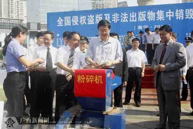 根據(jù)全國“掃黃打非”工作小組辦公室統(tǒng)一部署,4月22日,廣西“掃黃打非”工作小組在南寧市設2012年全國侵權盜版和非法出版物集中銷毀活動主會場,在全區(qū)其他13個市設分會場,公開銷毀85萬件侵權盜版和非法出版物,以此警示、震懾違法犯罪分子和非法經(jīng)營者,以實際行動迎接“4•26”世界知識產(chǎn)權日。當日,自治區(qū)黨委常委、宣傳部長、自治區(qū)“掃黃打非”工作小組組長沈北海與駐桂領事館文化官員、區(qū)市“掃黃打非”工作小組領導及成員單位共同場上銷毀侵權盜版制品,并向?qū)W生代表贈送圖書和“綠書簽”,眾多相關從業(yè)人員及大學生在印有“拒絕盜版 助力創(chuàng)新”的條幅上簽名。